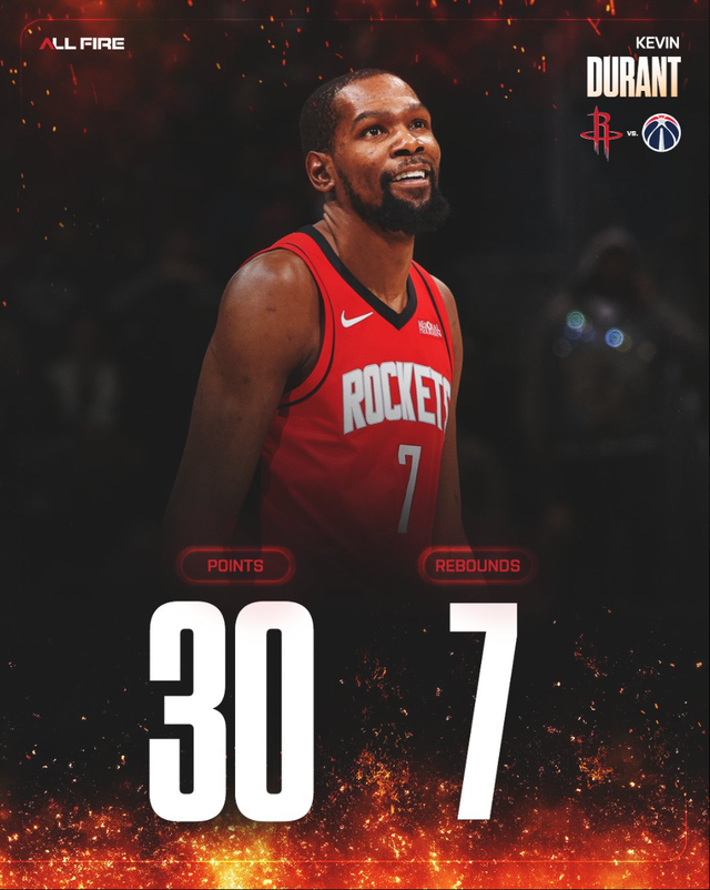 火箭记者克里斯-怀特:而且本赛季的火箭队是在范弗利特、亚当斯在这个赛季都无法登场,芬尼-史密斯伤愈复出后状态不佳的情况下。(这是都足以说明杜兰特帮助火箭更上一层楼)